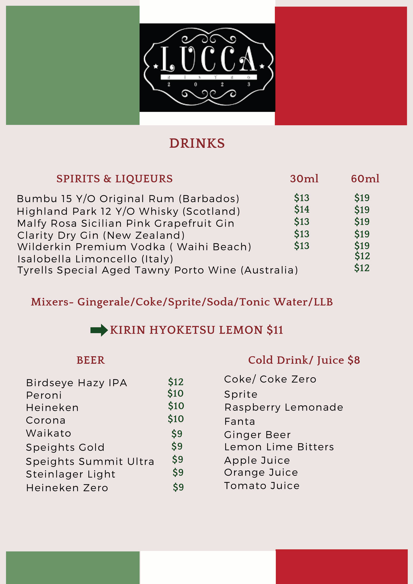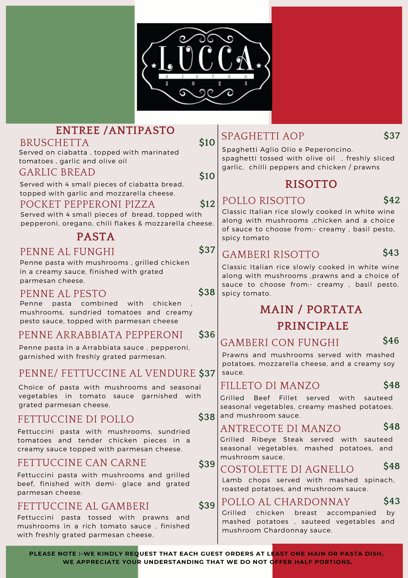 We were looking for a casual dinner and found Lucca. A very straightforward menu. We took the bruschetta as starter which was very good . Main was pollo a la gorgonzola also great taste. My wife took the pollo fettuccine, and described as lovely. As a dessert we took the chocolate brownie and the cannelloni: again good taste! But the service waiter Yusuf was excellent! He made our evening a great memory of Waihi beach. Keep on going like this Yusuf!
